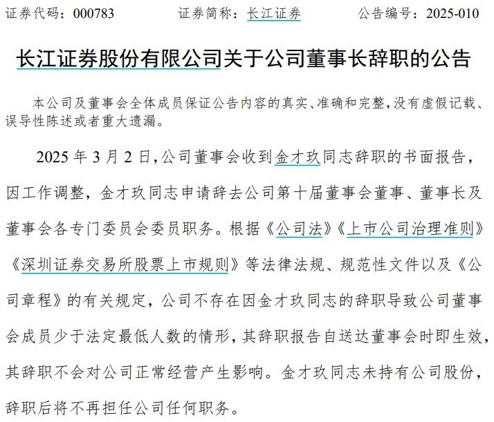 【大河财立方消息】3月2日,长江证券发布公告称,董事会收到金才玖辞职的书面报告,因工作调整,金才玖申请辞去公司第十届董事会董事、董事长及董事会各专门委员会委员职务。