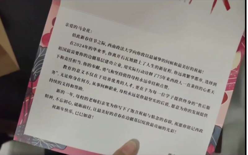 “无论你身在何方,从事何种职业,母校永远是你最坚实的后盾,愿意为你的发展提供持续的支持和帮助。祝愿你铭记西政精神,不忘初心,砥砺前行,让最美好的青春在边疆基层绽放最亮丽的光彩!”新春贺卡中写道。